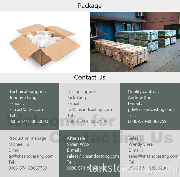 நிங்போ சிட்டி யின்ஜோ ருய்கன் மெஷினரி கோ, லிமிடெட் நேரடி உற்பத்தியாளர், மணல் காஸ்டிங் ஃபவுண்டரி, முதலீட்டு வார்ப்பு ஃபவுண்டரி மற்றும் எந்திர பட்டறை ஆகியவற்றை உள்ளடக்கியது, மேலும் டக்டைல் இரும்பு சாம்பல் இரும்பு மணல் வார்ப்பு பாகங்கள், முதலீட்டு வார்ப்பு பாகங்கள், அலுமினிய வார்ப்பு மற்றும் துல்லியமான எந்திர பாகங்கள் ஆகியவற்றை வழங்குகின்றன. உற்பத்தி செய்யப்பட்ட பாகங்கள் வாகன பாகங்களில் பரவலாகப் பயன்படுத்தப்படுகின்றன: விவசாய, கடல்; கட்டடக்கலை, இயந்திரங்கள், மருத்துவம்; உணவு இயந்திரங்கள், வால்வுகள் மற்றும் பல. அலுமினியத்தைப் பயன்படுத்திய பொருள் ; வெண்கலம்; பித்தளை; தாமிரம்; கார்பன் எஃகு; துருப்பிடிக்காத எஃகு மற்றும் பல. அதே நேரத்தில், நாங்கள் சி.என்.சி எந்திரத்தை வழங்க முடியும்; பாஸ்பேட்டிங்; கறுப்பு செயலாக்கம்; சூடான டிப் கால்வனிங்: தூள் பூச்சு: ஓவியம்: முலாம், வாடிக்கையாளர்களுக்கான சட்டசபை. 85% தயாரிப்புகள் வெளிநாடுகளுக்கு விற்கப்படுகின்றன, வாடிக்கையாளர்கள் அமெரிக்கா, கனடா, ஐரோப்பா யூனியன், ECT. நான் 15% தயாரிப்புகள் தேசிய சந்தையில் விற்கப்படுகின்றன.